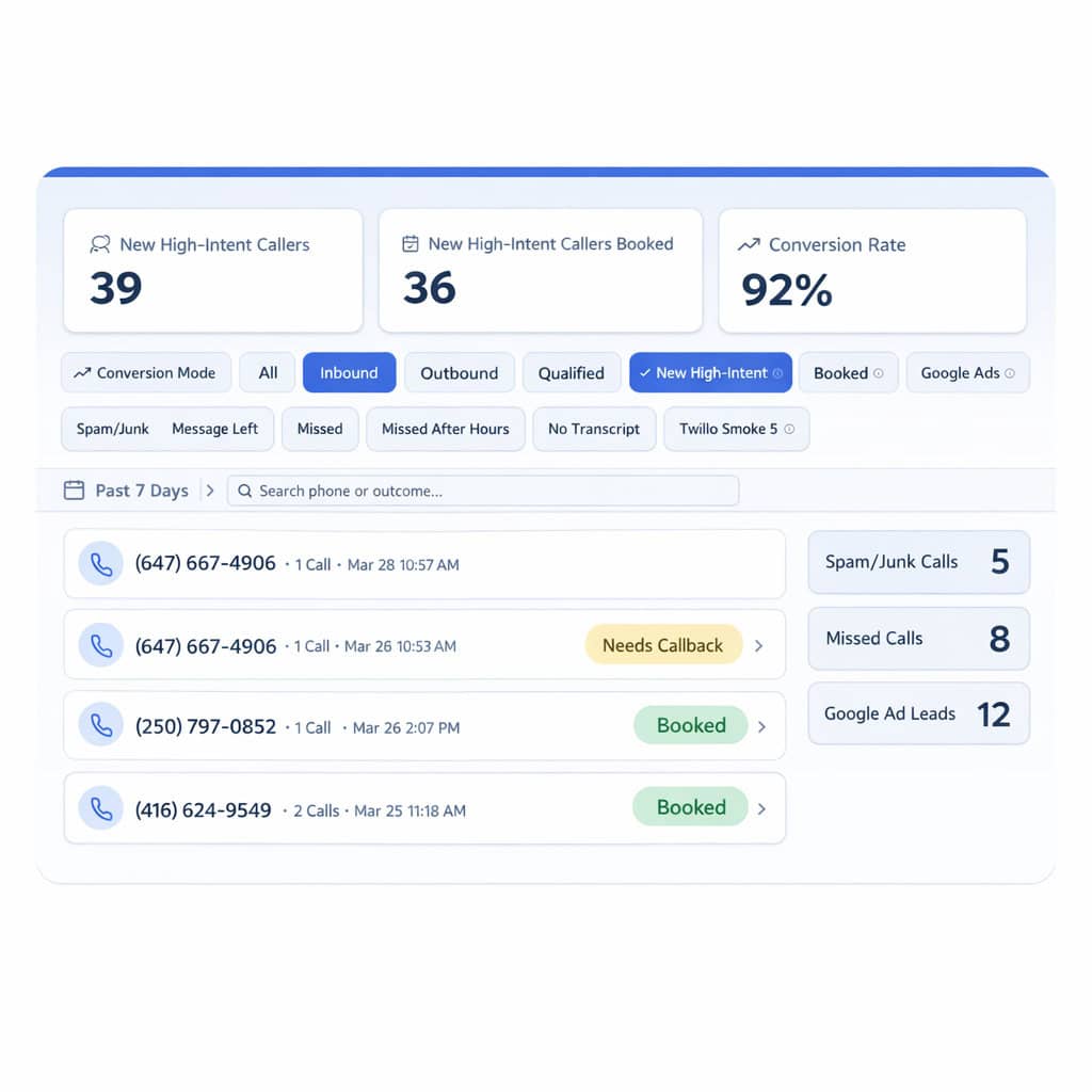 Booked, not booked, needs callback, voicemail, spam/junk, missed, and more. The taxonomy is richer than simple booked/not booked scoring.